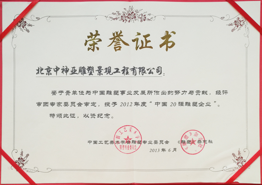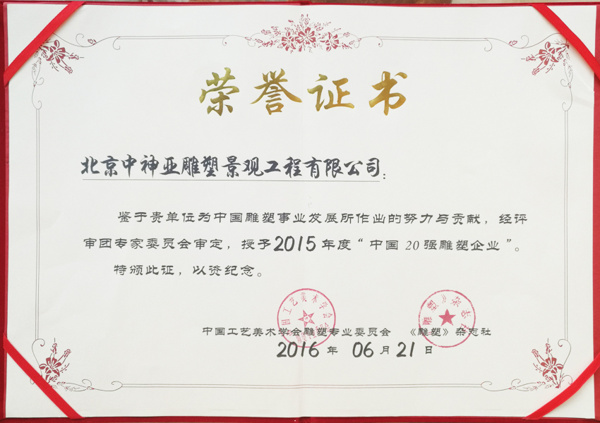 中神亞雕塑企業始建于1986年,(期前身為溫嶺藝術雕刻廠北京分廠)是設計和制作不銹鋼,鈦金屬,鍛銅,鑄銅,石刻等室內外雕塑的專業企業。是中央美術學院雕塑系和清華大學美術學院雕塑系實習創作基地,亦是中國美術家協會雕塑藝術委員會和中國工藝美術學會雕塑專業委員會特別推薦企業;是全國雕塑企業委員會副主任委員單位;是中國雕塑學會理事會員單位;2010年增選為中國建設文化藝術協會環境藝術專業委員會常務理事單位;2011年批準加入為中國建筑金屬結構協會會員,2012年增選為中國建筑金屬結構協會第十屆理事會理事單位;中國鋼結構協會團體會員;是具備住建部核準可承擔各種類型藝術鋼結構、藝術網架結構工程三級資質企業...