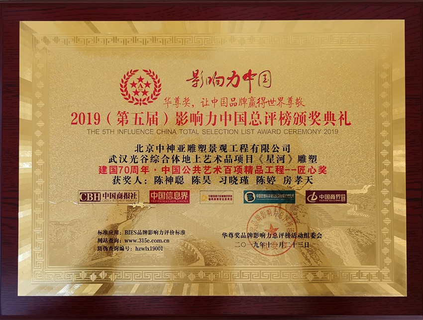 中神亞公司匠心打造的武漢光谷綜合體地上藝術(shù)品項(xiàng)目《星河》雕塑,榮膺建國70周年-中國公共藝術(shù)百項(xiàng)精品工程--匠心獎(jiǎng),同時(shí)中神亞創(chuàng)始人陳神聰董事長榮膺新時(shí)代-最美奮斗者榮譽(yù)稱號(hào)。